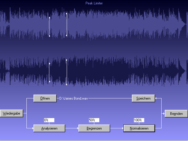 Peak Limiter bearbeitet Ihre 16-Bit-Sounddateien mit einem ausgeklügelten Algorithmus. Pegelspitzen, die ein von Ihnen definiertes Niveau überschreiten, werden weich heruntergeregelt, so daß das menschliche Ohr danach keinen Unterschied zum Original feststellen kann. Die Verminderung der Pegelspitzen ermöglicht es, die Gesamtlautstärke der Sounddatei beträchtlich zu erhöhen, ohne digitale Übersteuerungen und Verzerrungen zu verursachen! Peak Limiter kann beim CD-Mastering dazu verwendet werden, alle Tracks auf eine einheitliche Lautstärke zu bringen. Peak Limiter kann einzelne Sound-Samples, komplett arrangierte Musikaufnahmen und digitalisierte Sprache aufwerten. Das Ergebnis klingt im Vergleich zum Original druckvoller, direkter und ausgeglichener. Es kann durch später hinzukommendes Rauschen weitaus weniger stark beeinträchtigt werden. Die Gefahr, daß Ihr Equipment bei extrem hoher Wiedergabelautstärke Schaden nimmt, wird verringert. Dies alles sind optimale Bedingungen für Wiedergabe und Weiterverarbeitung. Im Batch-Modus kann Peak Limiter auch mehrere Dateien auf einmal verarbeiten. |